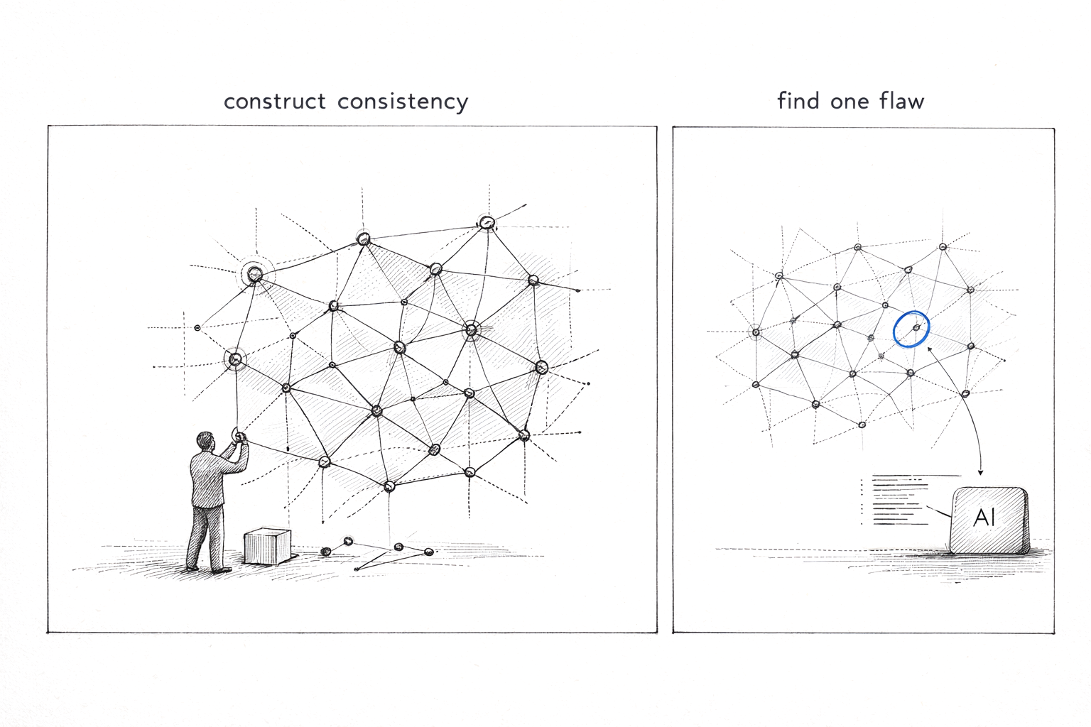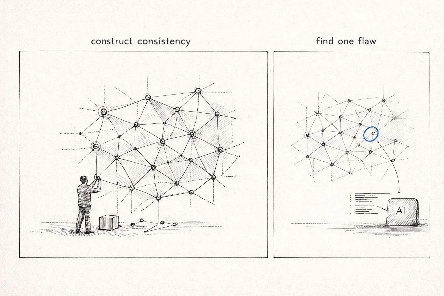 Left: the evaluator's task — constructing a consistent environment across many dimensions. Right: the AI's task — finding a single inconsistency.