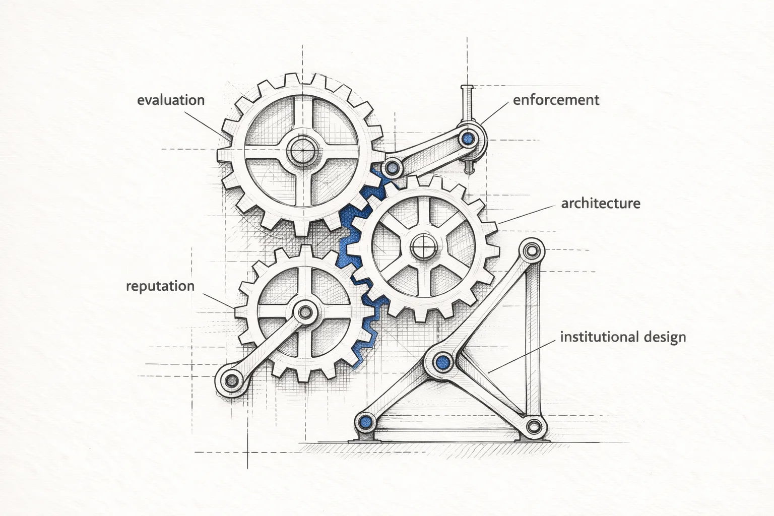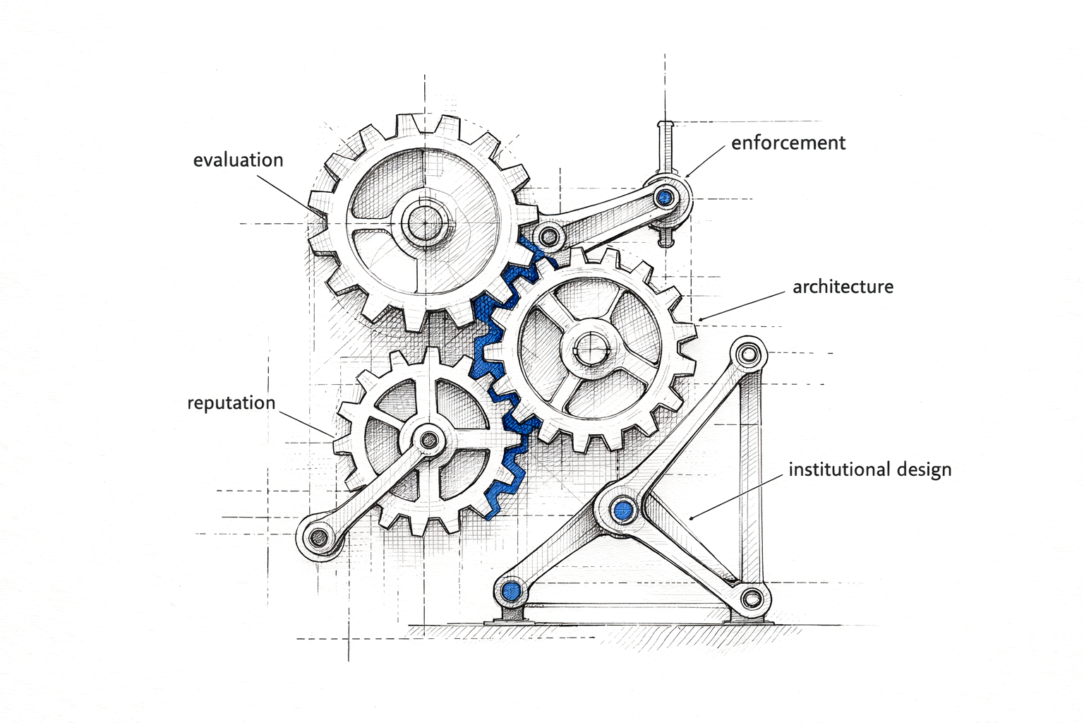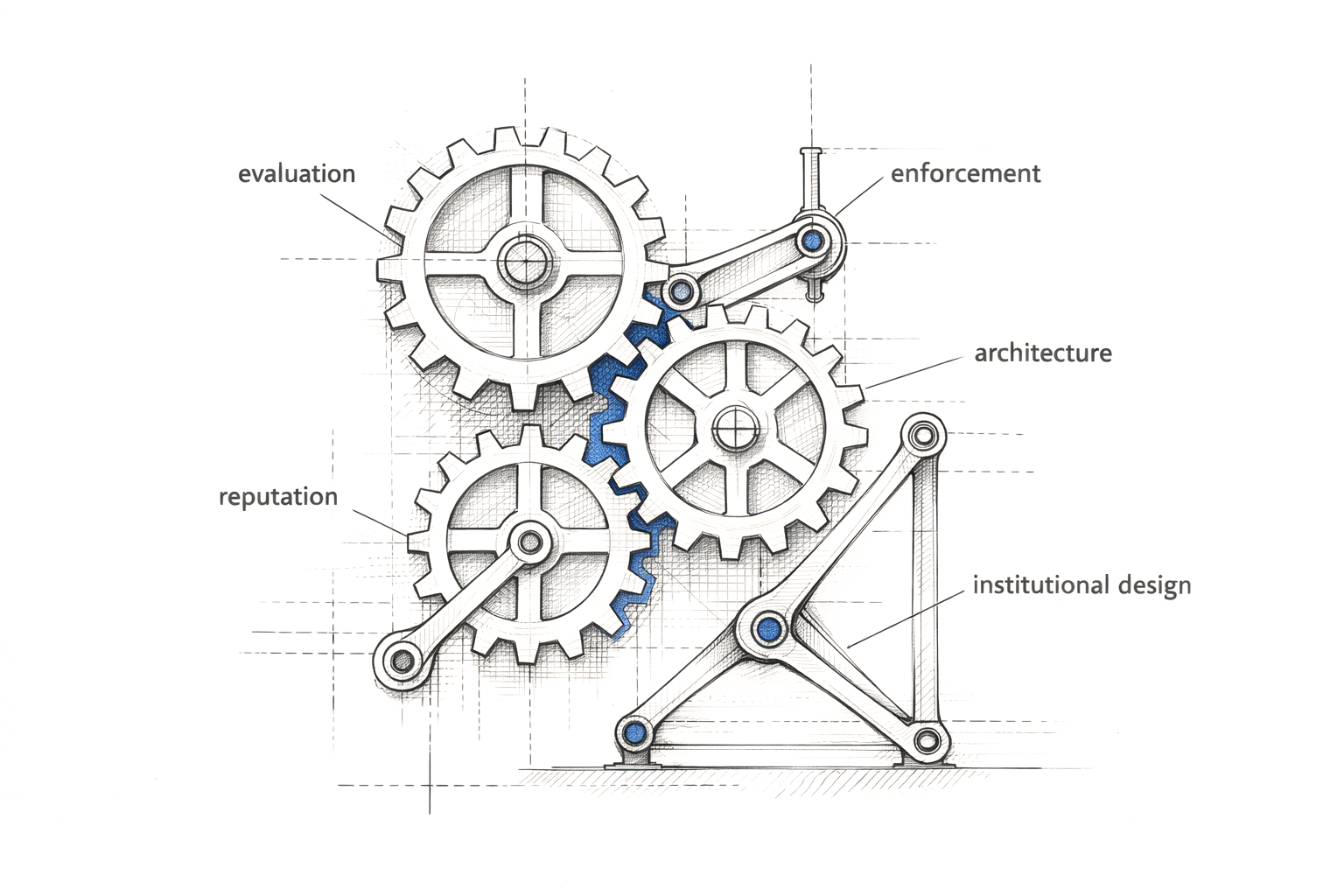 Five institutional mechanisms — evaluation, enforcement, architecture, reputation, and institutional design — interlocking. No single mechanism is sufficient; the combination covers what any individual tool misses.